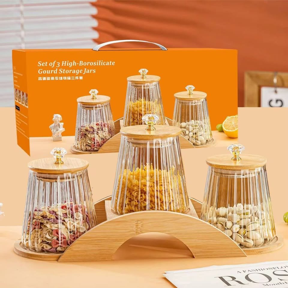 bocaux de rangement en verre borosilicate avec couvercles en bambou et un support en bois 3 pièces