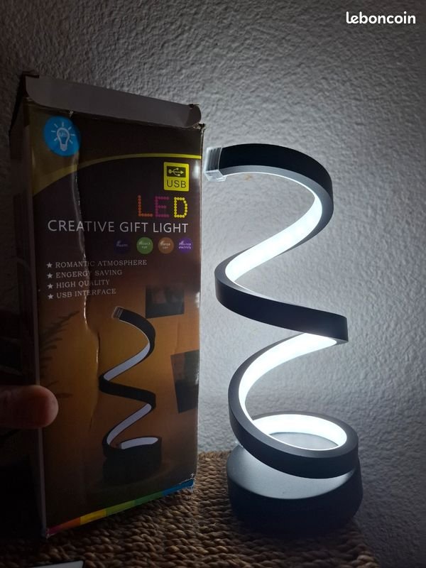 lampe de table LED en spirale moderne alimentée par USB. Elle est commercialisée comme un article de cadeau créatif et décoratif, souvent utilisé pour créer une ambiance romantique dans les chambres ou les salons.