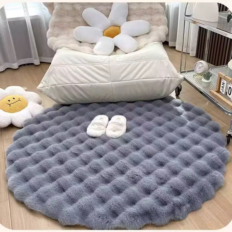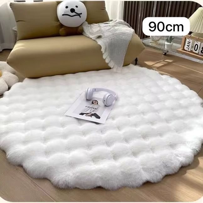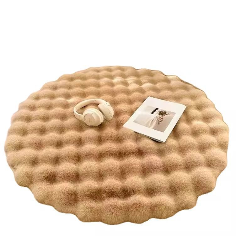 tapis rond épais et moelleux en fausse fourrure, souvent désigné sous les noms de tapis “bulle” ou “crémeux” en raison de sa texture. Caractéristiques principales Matériau Principalement fabriqué à partir de fausse fourrure ou de polyester à haute densité, il offre une sensation ultra douce et veloutée. Design Sa forme